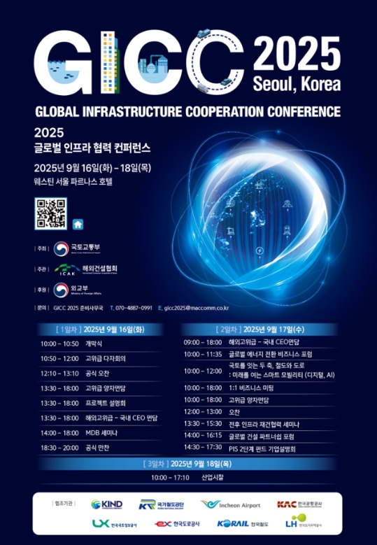 [뉴스스텝] 국토교통부가 주최하고 해외건설협회(회장 한만희)가 주관하는 ‘글로벌 인프라 협력 콘퍼런스(Global Infrastructure Cooperation Conference, GICC) 2025’가 9월 16일 오전 10시 개막식을 시작으로 3일간 웨스틴 서울 파르나스 호텔(삼성동 소재)에서 개최된다.