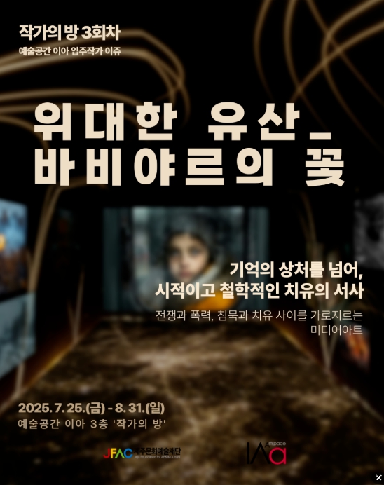 [뉴스스텝] 제주문화예술재단(이사장 김석윤)이 운영하는 예술공간 이아는 7월 25일부터 8월 31일까지 레지던시 입주작가 릴레이 쇼케이스전 '작가의 방'세 번째 전시를 개최한다. 이번 전시는 지난 6월 2회차 김현성 작가의 설치 전시에 이어 이쥬 작가의 사진, 미디어아트 전시 《위대한 유산_바비야르의 꽃》을 3회차로 선보이며, 작품을 통해 전쟁의 상흔과 인간 존재에 대한 철학적 질문을 시각화하여 선보인다.