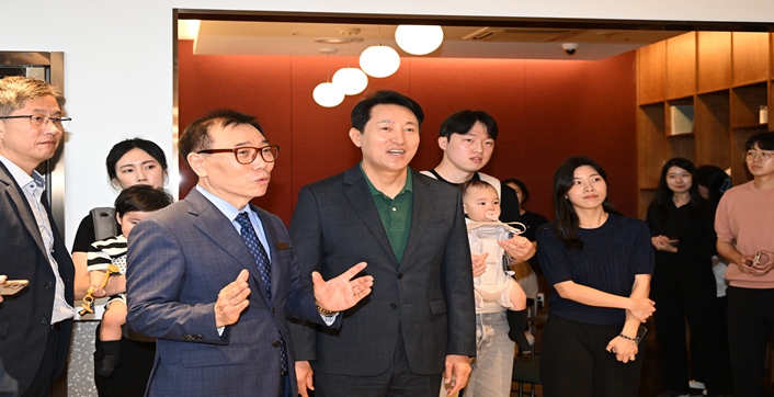 | ▲ 오세훈 서울시장이 13일 송파구 문정동에 위치한 '비아파트형 미리내집'을 함께 방문한 서울 베이비 엠버서더와 커뮤니티센터 내부를 둘러보고 있다. |