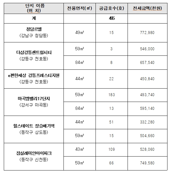 전세금은 최저 3억 3천만원(동작구 힐스테이트 장승배기역 44㎡)부터 최고 7억 7천만원(강남구 청담르엘 49㎡)까지다. 자세한 내용은 SH공사 입주자 모집 공고문에서 확인할 수 있다.