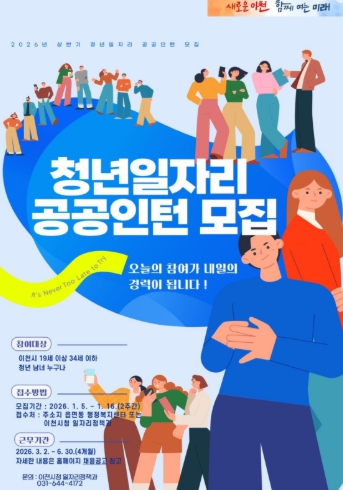 [뉴스스텝] 이천시는 2026년 1월 5일부터 1월 16일까지 ‘청년일자리 공공인턴사업’의 상반기 참여자 47명을 모집한다.