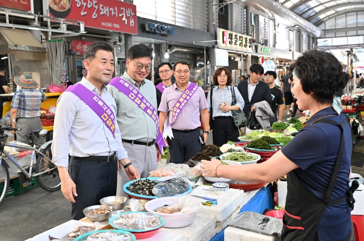 ▲ 김영길 중구청장이 25일 태화시장에서 박경흠 중구의장, 중구청 관계 공무원들과 여름 휴가철 맞이 물가안정 홍보 활동(캠페인)을 펼쳤다.