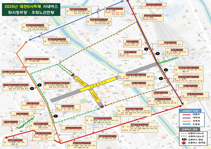 시는 축제 기간 교통 통제가 이뤄지는 도심 구간을 경유하는 총 29개 시내버스 노선을 우회 운행할 계획이다. 우회 운행은 8월 6일 첫차부터 17일 막차까지 적용되며, 급행 1·2·4번, 일반 101·103번 등 총 365대의 버스가 대흥로와 우암로를 경유하게 된다.