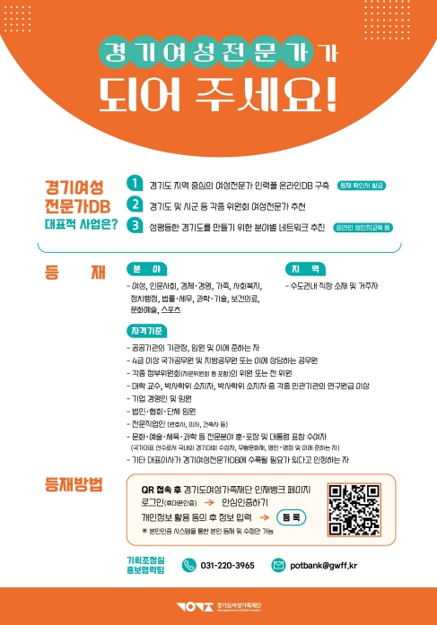 특히 분야별 여성전문가 확충을 위해 현재 신규등재자를 상시 모집하고 있으며 10월 10일까지 등재참여 이벤트도 진행한다. 등재 대상은 경기도에 거주하거나 도내에서 활동하는 법인․협회․단체 임원, 전문경영인, 법조계인사, 과학기술분야 전문가와 문화예술계 인사 등 각 분야별 전문직업인이다.