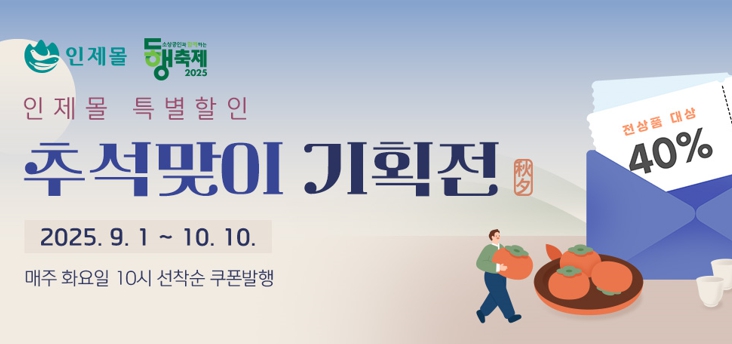 이번 추석맞이 기획전 행사기간 동안 인제몰 회원은 모든 상품을 40% 저렴하게 구매할 수 있는 할인쿠폰을 받을 수 있다. 쿠폰은 행사기간 중 매주 화요일 오전 10시에 선착순으로 발급되며, 1만 원 이상 구매 시 최대 4만 원까지 할인 받을 수 있다.