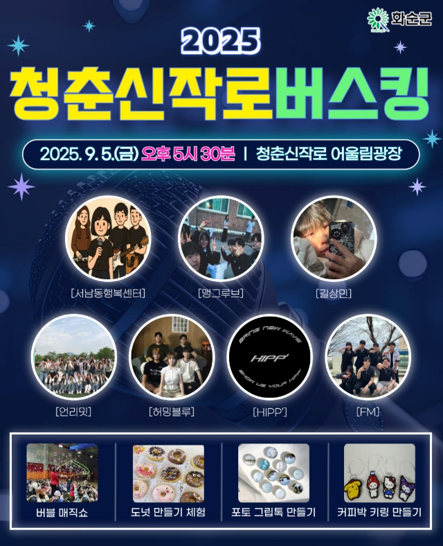 [뉴스스텝] 화순군은 오는 9월 5일 금요일 오후 6시 청춘신작로 어울림광장에서 청년 아티스트들의 버스킹 공연을 개최한다고 밝혔다.
