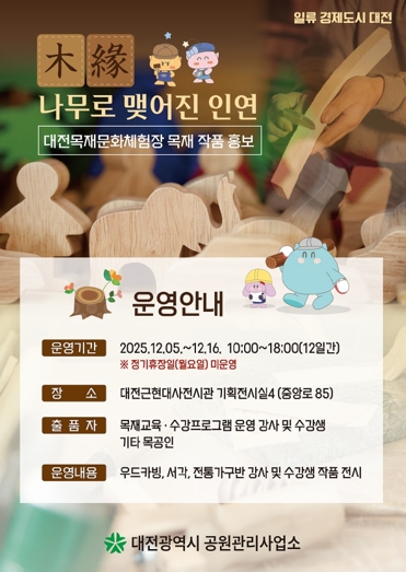 [뉴스스텝] 대전시는 공원관리사업소(목재문화체험장) 주관으로 12월 5일부터 16일까지 대전근현대전시관 기획전시실에서 목재교육·수강 프로그램에 참여한 강사와 수강생들의 작품 80여 점을 특별전시한다.