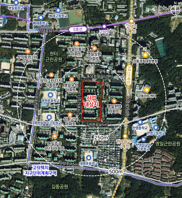 고덕현대아파트와 명일한양아파트(신속통합기획 자문사업 진행 중)에서 공공보행통로 각 5m, 통경축 각 15m를 확보할 계획이다.