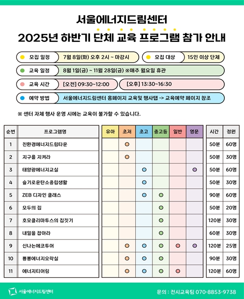 8월 1일부터 초중고 대상 11종 단체 교육 및 연령별 맞춤형 생태·에너지 교육 제공