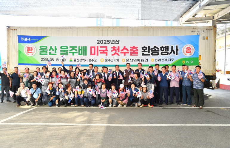 울주군은 18일 청량읍 울산원예농협 율리사업소에서 이순걸 군수, 최길영 울주군의회 의장, 울산원예농업협동조합장, 생산농가 대표 등이 참석한 가운데 울주배의 미국 첫 수출 기념 환송행사를 개최했다.