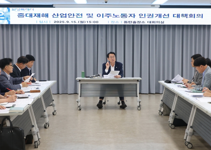 [뉴스스텝] 정명근 화성특례시장은 15일 동탄출장소 대회의실에서 ‘중대재해 산업안전 및 이주노동자 인권개선 대책 회의’를 열고 안전하고 공정한 노동 환경 조성을 위한 방안을 논의했다.