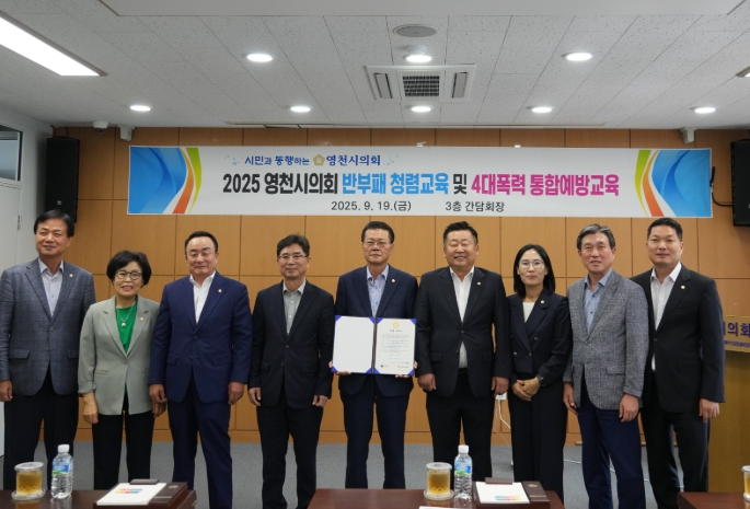 [뉴스스텝] 영천시의회는 지난 19일 의회 간담회장에서 시의원 전체를 대상으로 반부패·청렴교육 및 4대 폭력예방 통합교육을 실시했다.
