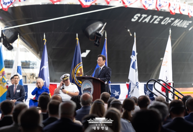 이 대통령은 축사를 통해 "대한민국의 조선업이 미국의 해양 안보를 강화하고 미국 조선업 부활에 기여하는 새로운 도전의 길에 나선다"며, "MASGA(마스가) 프로젝트로 미국 조선업과 대한민국 조선업이 더불어 도약하는 '윈윈'의 성과를 만들어낼 것"이라고 강조했다.
