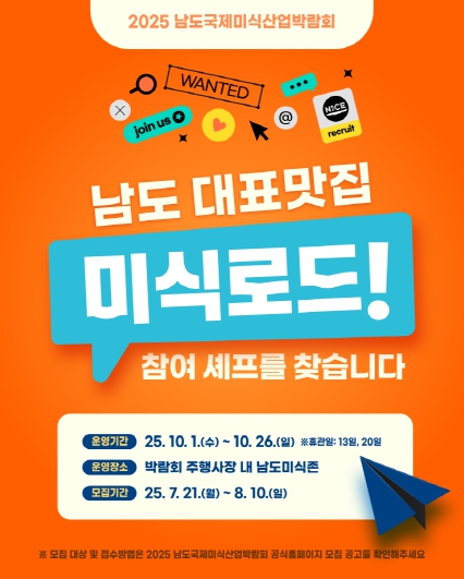 [뉴스스텝] 광양시는 전라남도와 목포시가 주최하는 '2025 남도국제미식산업박람회'의 핵심 프로그램인 ‘남도 대표맛집 미식로드’에 참여할 셰프 및 지역 맛집 운영자를 모집한다고 8월 1일 밝혔다.