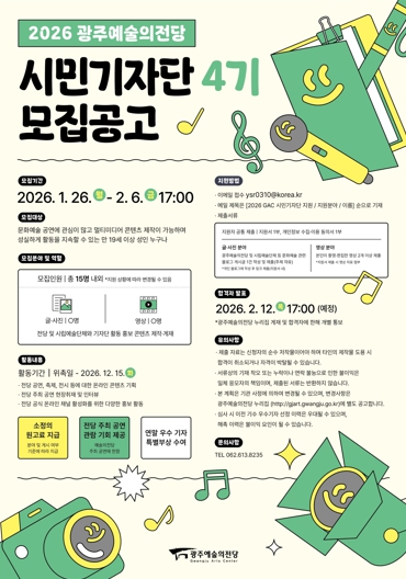 [뉴스스텝] 광주광역시 예술의전당은 전당의 다양한 공연 정보와 문화 소식을 직접 취재하고 공식 온라인 채널을 통해 알릴 ‘2026 광주예술의전당 시민기자단 4기’를 26일부터 2월6일까지 모집한다.