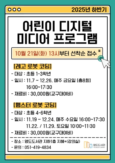 [뉴스스텝] 영도도서관에서 어린이복합문화공간의 디지털 교육환경을 기반으로 관내 어린이들의 디지털 역량 강화와 창의력 향상을 위한 ‘2025년 하반기 어린이 디지털 미디어 프로그램’을 운영한다.