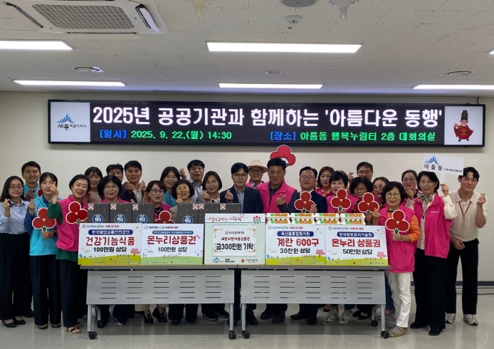 [뉴스스텝] 세종특별자치시 아름동지역사회보장협의체(공동위원장 이인환·조형관)가 22일 아름동 행정복지센터에서 관내 공공기관과 함께 추석맞이 후원 기탁식 ‘아름다운 동행’을 개최했다.