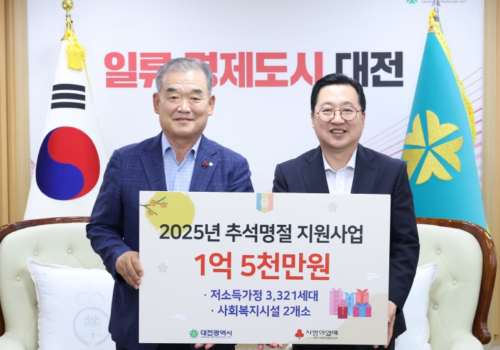[뉴스스텝] 대전시는 9월 22일 시청에서 대전사회복지공동모금회로부터 추석 명절을 맞아 저소득가정을 돕기 위한 성금 1억 5천만 원을 기탁받았다. 이날 행사에는 유재욱 대전사회복지공동모금회 회장이 참석해 이장우 대전시장에게 성금을 전달했다. 시는 기탁금 중 1억3,500만 원을 저소득 3,321가구에 현금으로 지원하고, 나머지 1,500만 원은 쪽방상담소와 이주외국인종합복지관의 명절맞이 행사에 사용할 계획이다.