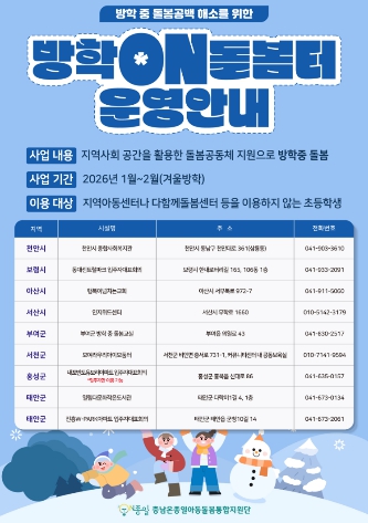 방학ON돌봄터는 천안시, 아산시, 서산시, 홍성군, 태안군, 부여군, 서천군에서 초등방학기간에 맞춰 운영예정이며, 운영주체는 종합사회복지관, 아파트입주자대표회의, 종교단체, 청소년문화의집 등이다.