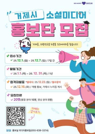 시 관계자는 “소셜미디어 홍보단은 다양한 시각에서 거제의 가치와 매력을 널리 알리는 중요한 역할을 해왔다”며 “거제시를 사랑하는 마음으로 적극적으로 활동할 열정 있는 크리에이터들의 많은 참여를 기대한다”고 말했다.