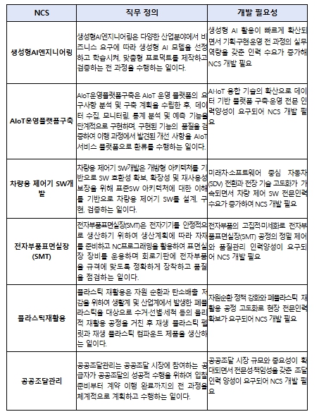 올해는 인공지능(AI) 활용 확산과 융복합 직무 확대에 따라 인력 수요가 늘고 있는 ‘생성형AI엔지니어링’, ‘AIoT운영플랫폼구축’, ‘차량용 제어기 SW개발’ 등 총 6개 직무를 국가직무능력표준으로 개발했다.