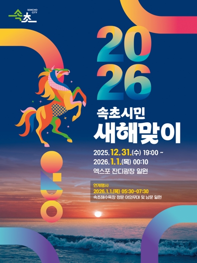 이병선 속초시장은 “병오년 붉은 말의 해가 상징하는 열정과 도전의 에너지를 가득 담은 ‘2026 속초시민 새해맞이 행사’를 통해 시민 화합과 행복을 기원하고, 속초시를 방문한 관광객과 시민이 안전하고 편안한 가운데 추억할 수 있는 새해를 맞이할 수 있도록 차질 없이 준비하겠다”고 말했다.