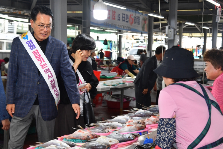 ▲ 울산 울주군이 추석 명절을 맞아 28일 남창옹기종기시장에서 ‘추석맞이 전통시장 장보기 행사’를 개최한 가운데 이순걸 군수와 관계 공무원들이 제수용품을 구입하고, 전통시장 이용 홍보 캠페인을 펼쳤다. |