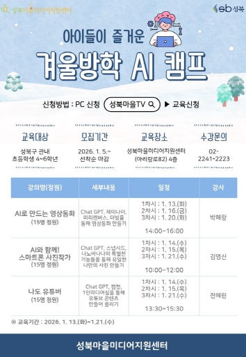 [뉴스스텝] 서울 성북구 성북마을미 디어지원센터가 오는 13일부터 21일까지 미디어 체험 프로그램인 ‘겨울방학 AI 캠프’를 운영한다.