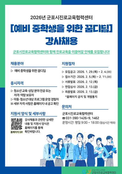 [뉴스스텝] (재)군포시청소년재단 군포시진로교육협력센터는 관내 예비중학생의 학교 적응과 진로 기초 역량 강화를 위해 '2026년 군포시진로교육협력센터 예비중학생을 위한 꿈디딤' 프로그램에 참여할 강사를 채용한다고 밝혔다.