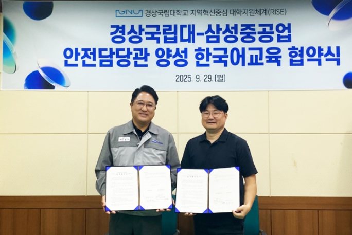 [뉴스스텝] 경상국립대학교 RISE사업단 산학친화프로그램과 삼성중공업은 9월 29일 오후 가좌캠퍼스 언어교육실 국제교육부처장실에서 외국인 근로자의 안전한 근로환경 조성과 지역사회 정주 여건 조성을 위해 ‘외국인 근로자 대상 한국어 교육체계 구축에 관한 업무협약’을 체결했다.