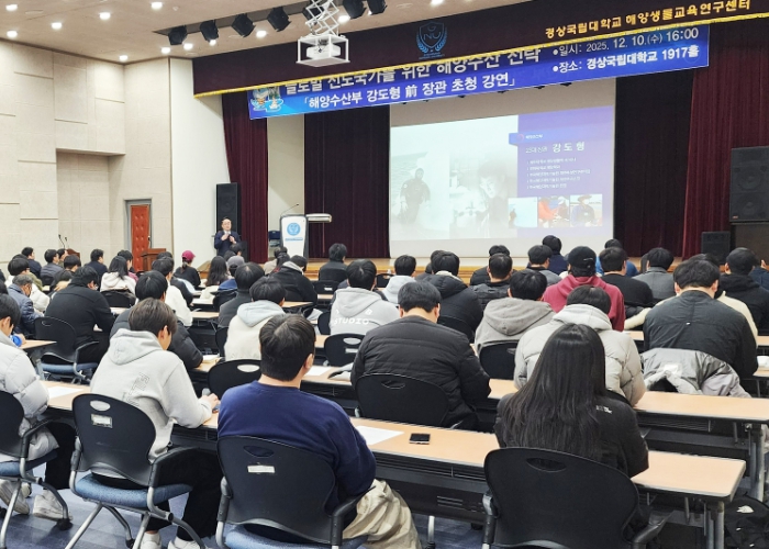 | ▲ 경상국립대학교(GNU) 해양과학대학은 12월 10일 해양생물교육연구센터에서 재학생 250여 명이 참석한 가운데 해양수산부 장관을 역임한 한국해양과학기술원 강도형 박사를 초청하여 ‘제4회 GNU 마린 드림 토크(Marine Dream Talk)!’를 성황리에 개최했다. |