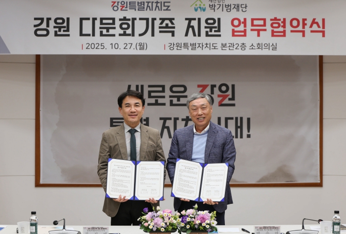 [뉴스스텝] 강원특별자치도는 10월 27일 오후 3시 30분, 도청 본관2층 소회의실에서 재단법인 박기범재단과 강원 다문화가족 지원을 위한 업무협약을 체결했다.