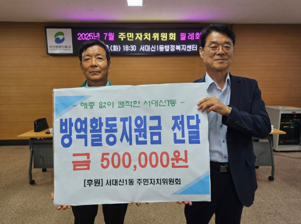 [뉴스스텝] 부산광역시 서구 서대신1동 주민자치위원회(위원장 정종영)는 지난 8일, 해충 없는 쾌적한 마을 조성을 위하여 서대신1동 주민자율방역단(새마을지도자협의회)에 방역활동지원금 50만원을 전달했다.