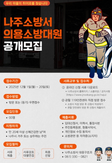 [뉴스스텝] 나주소방서는 지역사회의 안전을 책임질 “2025년 하반기 의용소방대 신규대원 모집”에 나선다. 모집 기간은 오는 12월 1일부터 20일까지이며, 신천서류는 나주소방서 홈페이지 또는 나주소방서를 비롯한 119안전센터에서 지원 서류를 배부하고 접수를 진행한다.
