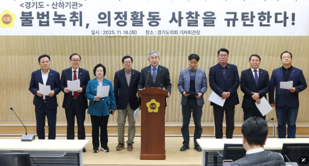 [뉴스스텝] 경기도의회 도시환경위원회(김시용 위원장, 국민의힘, 김포3)는 18일 경기도의회 기자회견장에서 진행된 기자회견을 통해 경기도 기후환경에너지국 소속 공직자가 산하기관인 코리아경기도주식회사 직원에게 의원 간담회 내용을 불법 녹음하도록 지시한 사실을 강력히 규탄했다.