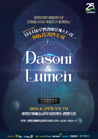 [뉴스스텝] 광명장애인종합복지관은 개관 25주년을 맞아 오는 11월 27일 오후 7시, 광명극장에서 ‘다소니&루멘챔버오케스트라 제9회 정기연주회’를 개최한다. 이번 연주회는 복지관을 위해 꾸준히 후원과 자원봉사를 실천해온 후원자와 자원봉사자를 초청해, 장애인 예술가의 무대를 함께 즐기는 감사의 자리로 마련됐다. 복지관은 이번 행사를 통해 지역사회가 장애예술을 보다 가까이 경험하고, 문화예술을 매개로 한 긍정적 인식 변화가 확산되기를 기대하고 있다.