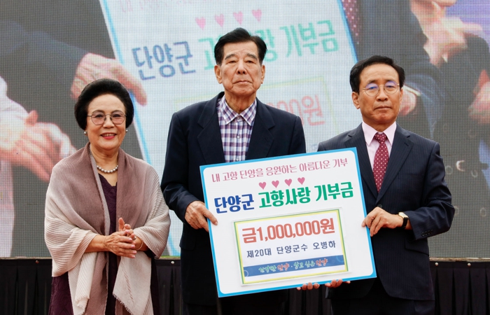 [뉴스스텝] 충북 단양군은 지난 19일 단양 공설운동장에서 열린 신단양 이주 40주년 기념식에서 제20대 단양군수를 역임한 오병하 전 군수가 고향사랑기부금 100만 원을 기탁했다고 밝혔다.