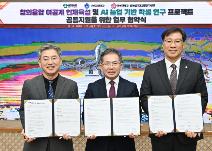 [뉴스스텝] 군위군이 1월 2일 군청 제2회의실에서 군위고등학교, 경북대학교 밭농업기계개발연구센터와 함께 창의융합 이공계 인재 육성 및 AI 농업 기반 이공계 인재 육성을 위한 학생 연구 프로젝트 공동 지원 업무협약을 체결했다.