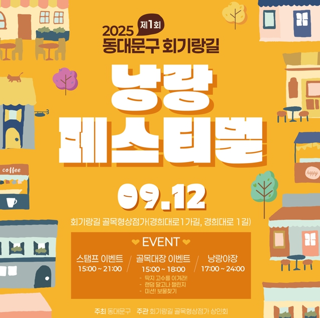 12일에는 경희대학교 정문 골목상권 일대에서 ‘낭랑 페스티벌’이 개최된다. 이날 오후 3시부터 12시까지 다양한 문화 체험부스가 운영되며, 개막식과 축하공연을 시작으로 낭랑 야장 마켓과 6팀이 참여하는 버스킹 공연이 이어져 젊은 층과 가족 단위 방문객 모두에게 즐거움을 선사할 예정이다.