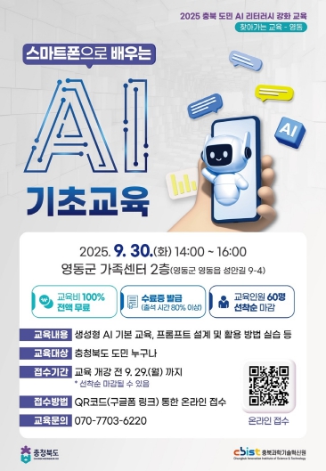 [뉴스스텝] 충북도와 충북과학기술혁신원(원장 고근석)은 도민들의 인공지능 활용 역량을 높이기 위해 오는 9월 30일 오후 2시부터 4시까지 영동군 가족센터 2층에서 '스마트폰으로 배우는 AI 기초교육'을 개최한다.