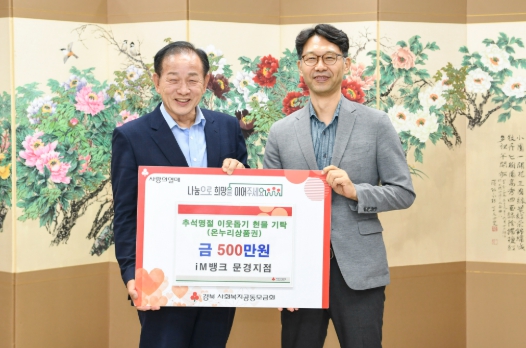 [뉴스스텝] 문경시는 지난 9월 23일, 추석 명절을 앞두고 지역 내 소외된 이웃들이 따뜻한 명절을 보낼 수 있도록 iM뱅크 문경지점(지점장 이영우)으로부터 온누리상품권 500만 원 상당을 기탁받았다.