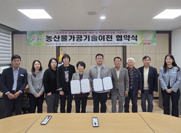 [뉴스스텝] 문경시농업기술센터는 10월 24일 농업기술센터 소회의실에서 “오미자, 배, 도라지추출물을 포함하는 호흡기 염증질환 예방 또는 치료용 조성물”(특허번호 제 : 10-2169920호) 특허기술을 관내업체인 “농업회사법인 행복팜(주)”에 이전하는 기술이전 협약식을 체결했다.