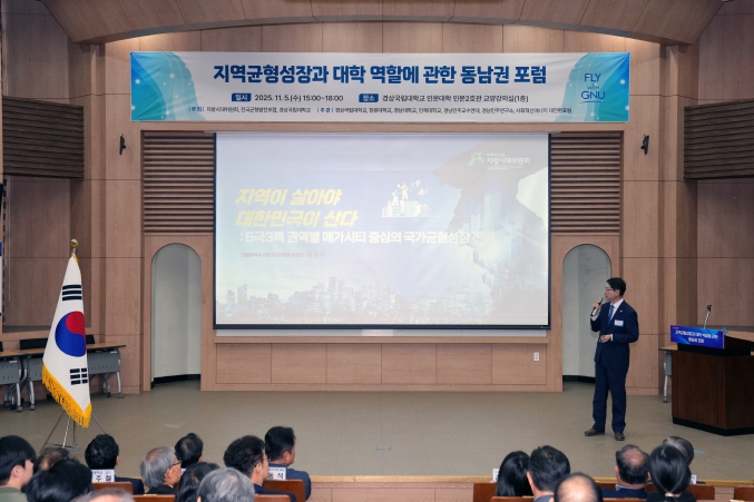 [뉴스스텝] 경상국립대학교는 11월 5일 오후 3시 가좌캠퍼스 인문대학 교양강의실에서 ‘지역균형성장과 대학 역할에 관한 동남권 포럼’을 개최했다.