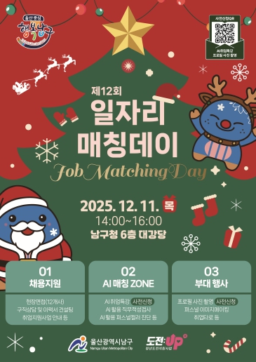 이번 행사는 12월 11일 오후 2시부터 4시까지 남구청 6층 대강당에서 열리며 단순한 채용행사가 청년·중장년·여성 생애주기별 직종에 맞춰 아닌 현장면접·취업지원·AI 체험·부대행사까지 한 번에 즐기는‘종합 취업 페스티벌’로 기획돼 누구나 부담 없이 오고 싶은 행사로 구성됐다.