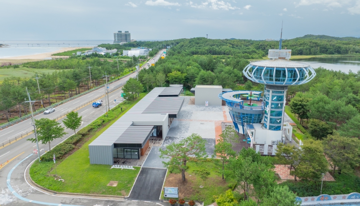 송지호 비지터센터는 2024년부터 2025년까지 죽왕면 오봉리 9-33, 9-34번지 일원에 조성된 관광휴게시설로 총사업비 40억 원을 투입해 부지 12,036㎡, 연면적 857.74㎡ 규모의 지상 1층 건물 3동으로 조성됐다.