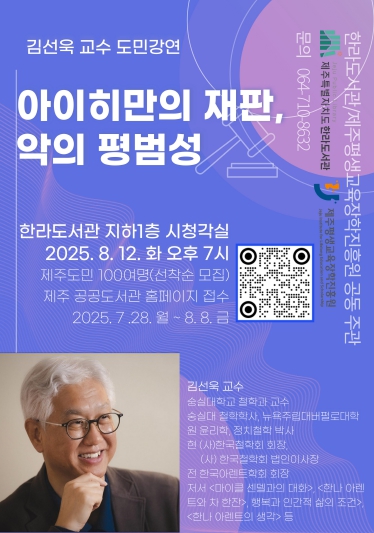 [뉴스스텝] 제주특별자치도 한라도서관(관장 양애옥)이 제주평생교육장학진흥원과 함께 국내 대표 철학자 김선욱 교수를 초청해 『아이히만의 재판, 악의 평범성』을 주제로 도민강연을 개최한다.