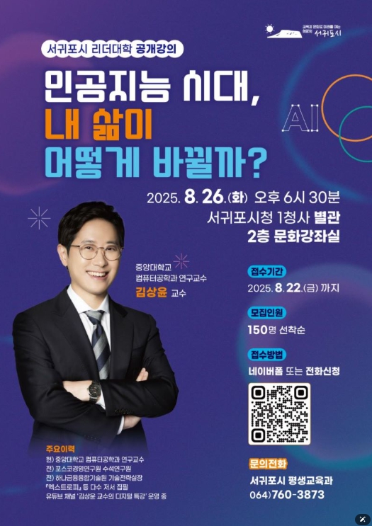 서귀포시 관계자는 “이번 강의가 인공지능 시대에 대한 시민들의 이해를 높이고, 변화에 현명하게 대응하는 데 도움이 되길 바란다”라며, “앞으로도 다양한 평생학습 기회를 확대해 나가겠다”라고 말했다.