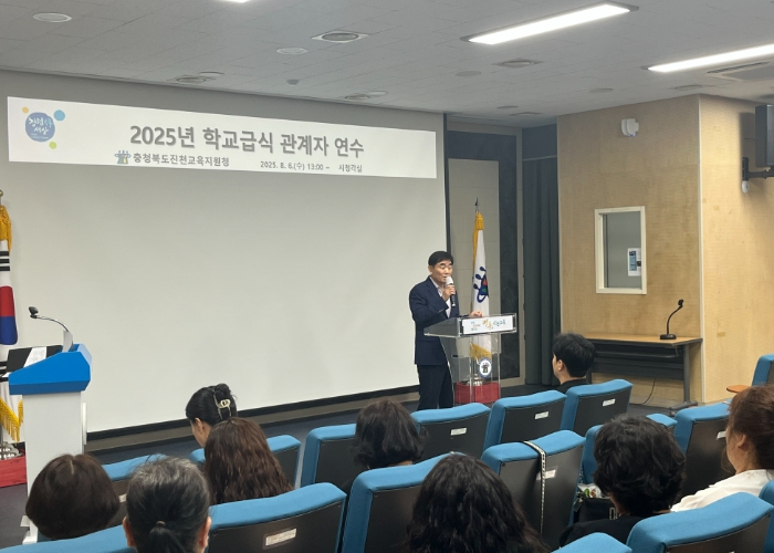 [뉴스스텝] 충청북도진천교육지원청은 학교지원센터 3층 시청각실에서 관내 유·초·중·고·대안학교 조리사, 조리실무사 등 급식관계자 170여명을 대상으로 2025년 학교급식 관계자 연수를 실시했다.