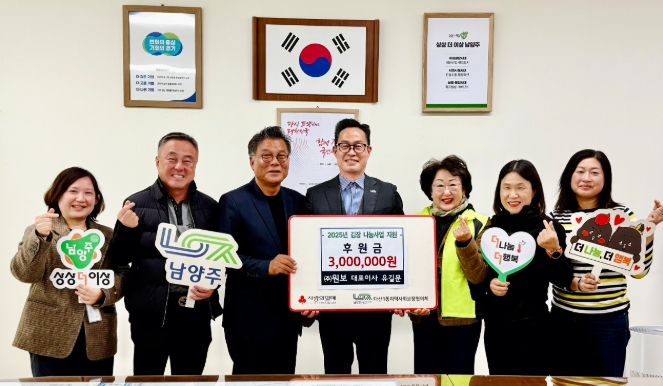[뉴스스텝] 남양주시는 29일 ㈜원보(대표이사 유길문)가 다산1동 지역사회보장협의체(위원장 정순옥)에 김장 나눔 사업비로 300만 원을 지정기탁했다고 밝혔다.