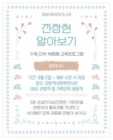 이번 프로그램은 김천 감문면 출신 바이올린 제작 명장 진창현 선생의 삶과 업적을 소개하는 전시와 연계하여 관람객들이 활동지를 직접 작성하고 ‘바이올린 입체 퍼즐’을 만들어보는 체험으로 구성된다. 이를 통해 전시 내용을 쉽고 재미있게 이해하고 손을 움직이는 과정에서 소근육 발달과 창의력 향상을 동시에 도모할 수 있다.